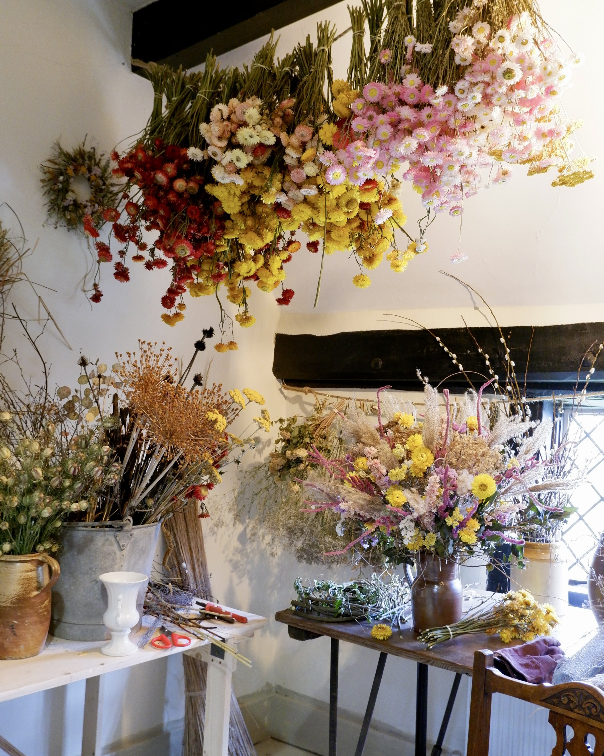 You will gain insight into my world of dried flower floristry, choosing from my large stocks of curious everlasting varieties and starting with a walk over to the drying garden if the weather permits.