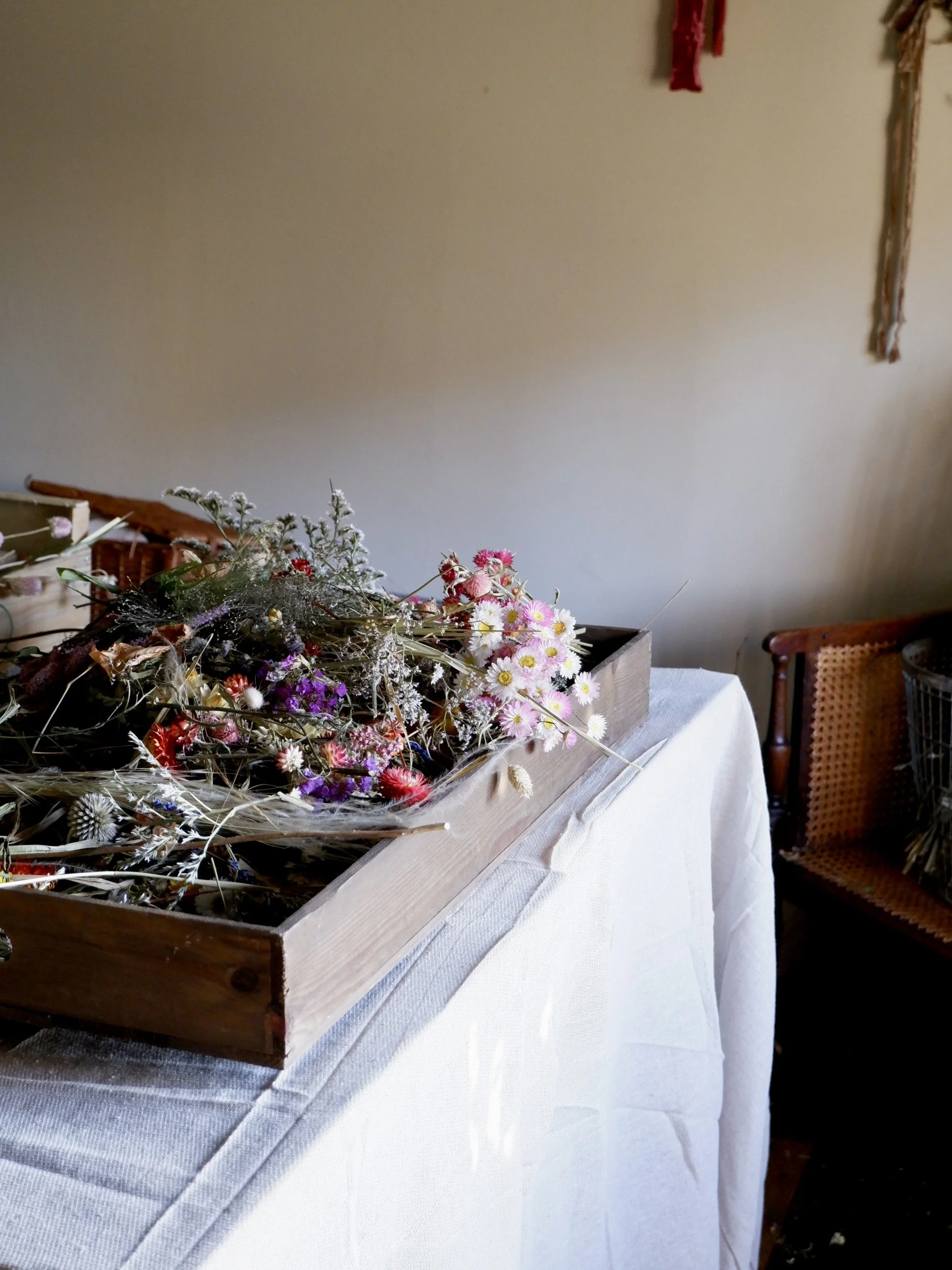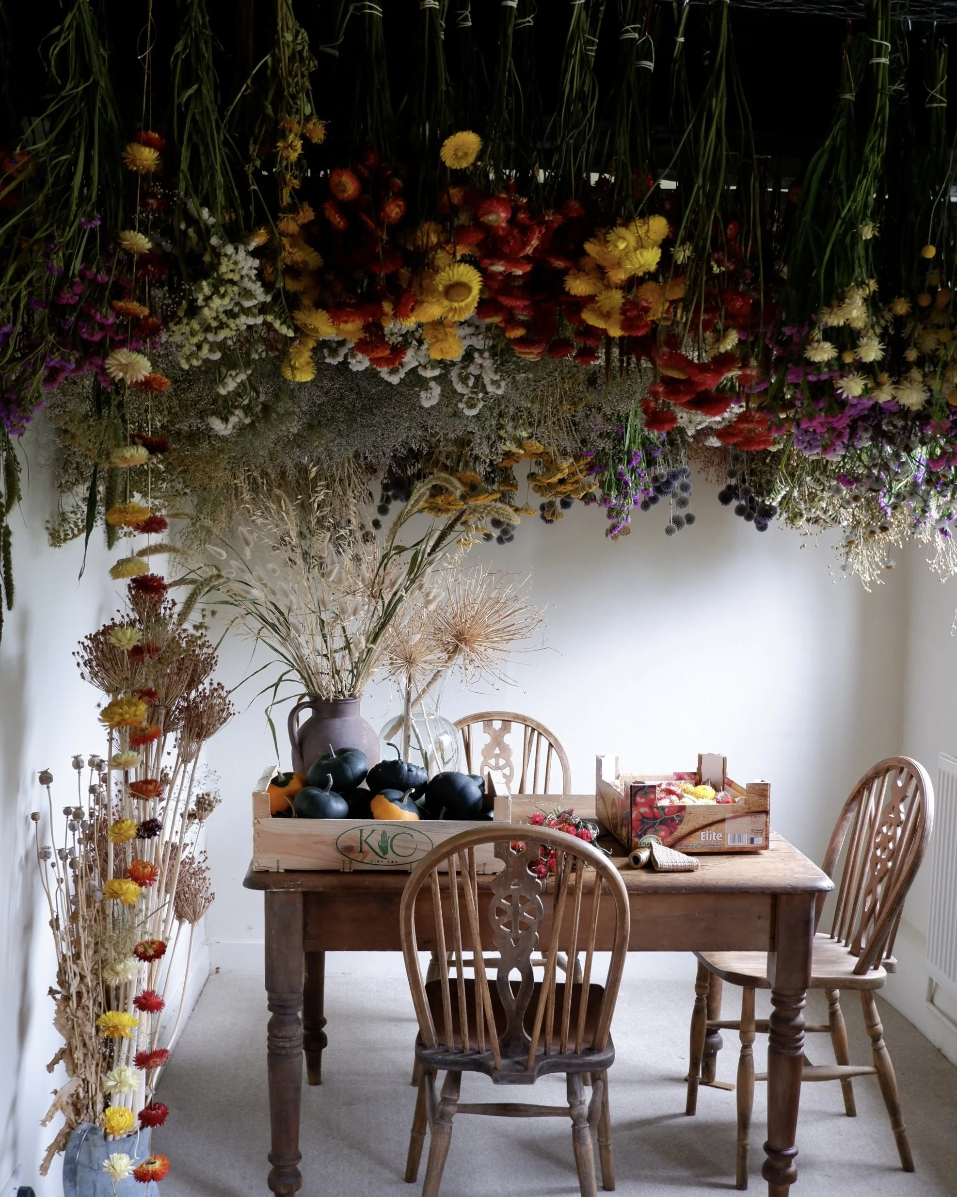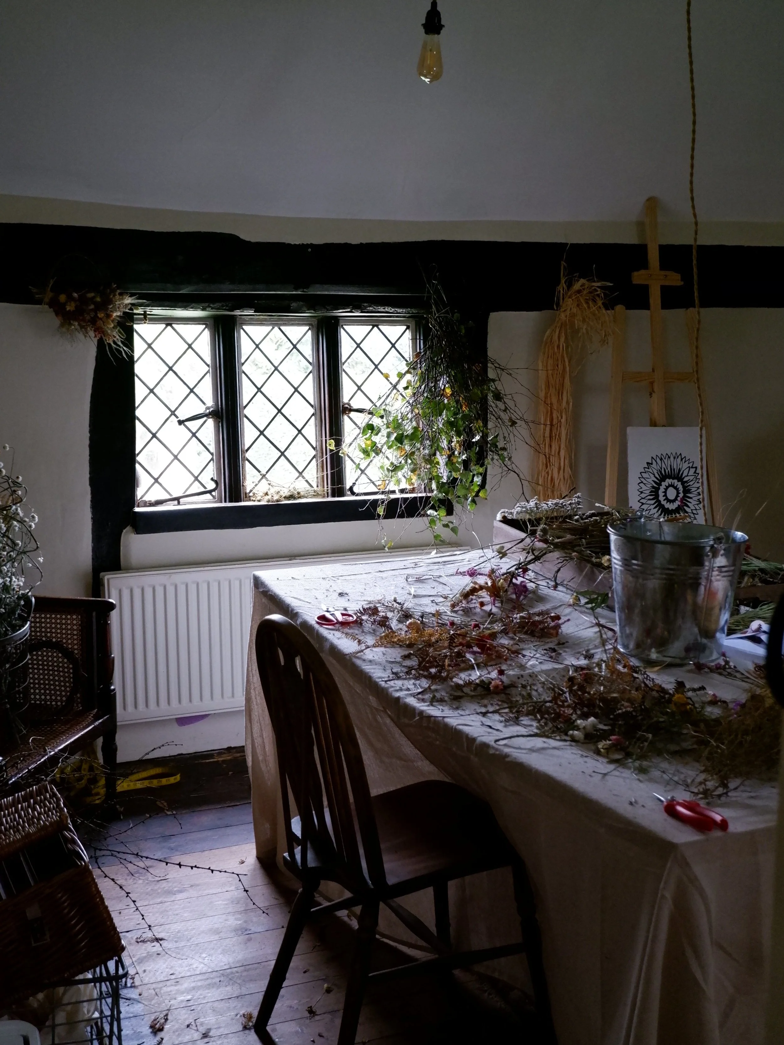 My home and studio is a 15th century cottage with wonky walls, ancient beams and a fire glowing in a nook. Filled with rustic antique curiosities, this space embodies the ramshackle style and is most importantly, teeming with dried flowers. Inside the cottage, the outside world seems to disappear, peace and quiet is abundant, and subtle colour and rustic charm reigns.